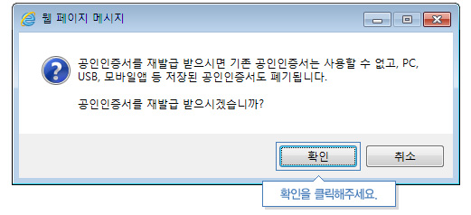 • 공동인증서 재발급에 해당하는 고객님에게만 재발급 메시지가 나옵니다.