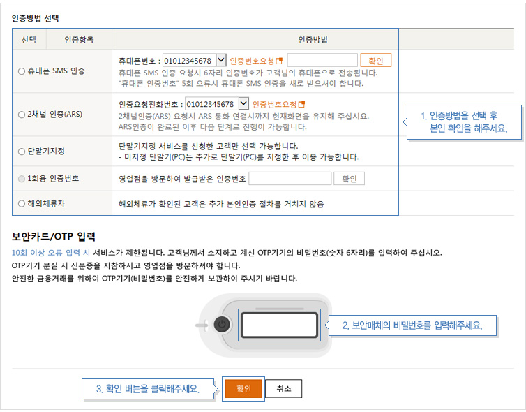 OTP기기 발급 고객님은 소유하신 OTP기기의 비밀번호(숫자6자리)를 입력하신 후 [확인] 버튼을 선택합니다.