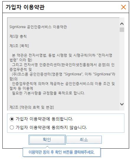• 가입자 이용약관에 동의하시고 [확인] 버튼을 선택합니다.