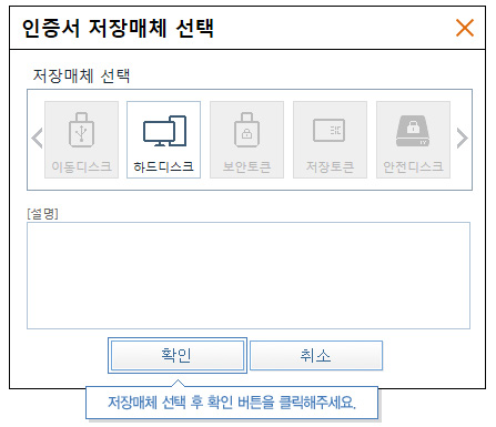 • 인증서를 저장할 매체를 선택 후 [확인] 버튼을 선택합니다. (기본 :하드디스크)