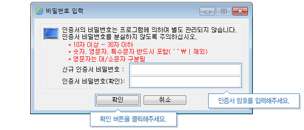 • 전자서명 비밀번호를 확인까지 두 번 입력 후 [확인] 버튼을 선택합니다. (한글은 입력할 수 없습니다.)