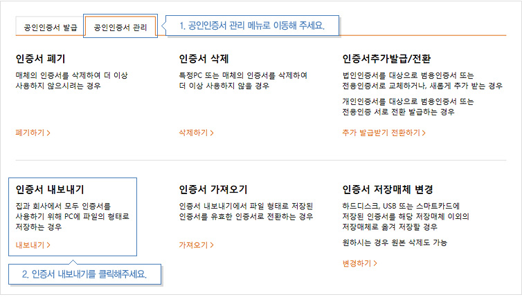 인증센터 메뉴로 이동한 후 “인증서관리”메뉴를 선택한 후 [인증서 내보내기]를 선택하세요.
