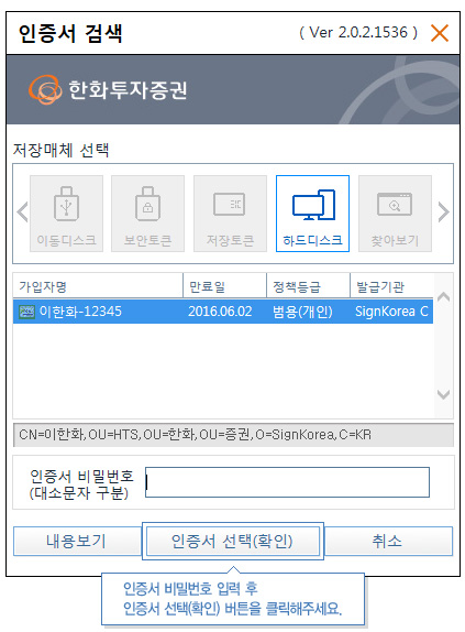 인증서 선택 후 “전자서명비밀번호”를 입력하신 후 [인증서선택(확인)] 버튼을 선택합니다.
