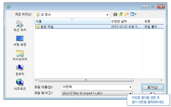 파일형식으로 전환된 인증서를 저장할 폴더를 정한 후 [열기] 버튼을 선택하면 해당위치에 저장됩니다.