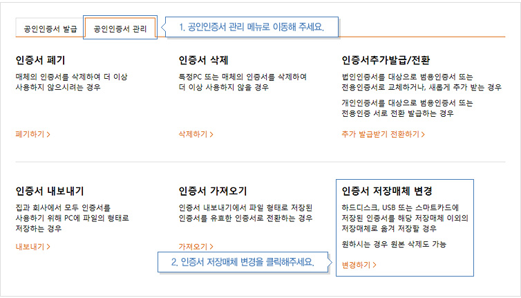 인증센터 메뉴로 이동한 후 “인증서 관리” 메뉴를 선택한 후 [저장매체 변경]를 클릭하세요.