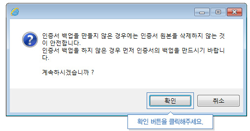 인증서 백업을 권유하는 메시지가 나옵니다. 계속진행을 원할 경우 [확인] 버튼을 선택합니다.