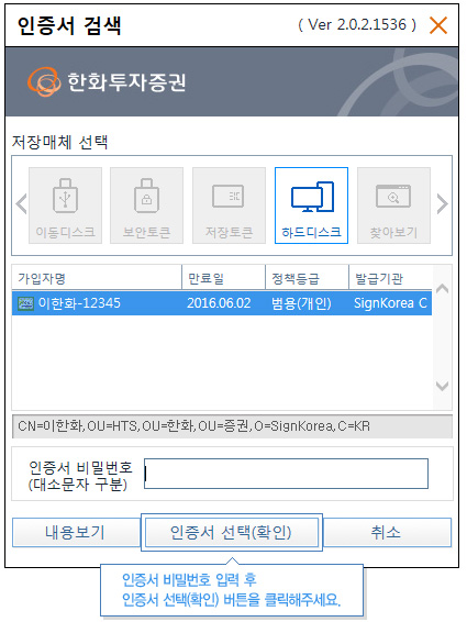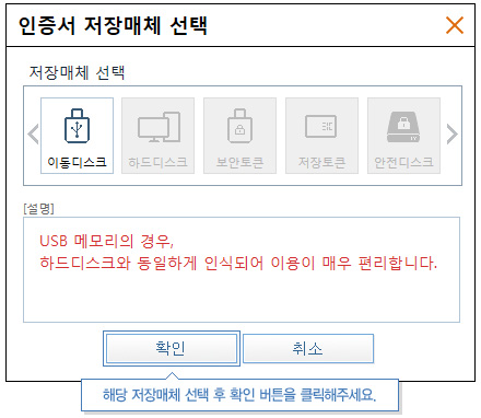 하드디스크, USB에 저장된 인증서를 해당저장매체를 선택후 [확인] 버튼을 선택하시면 저장됩니다.