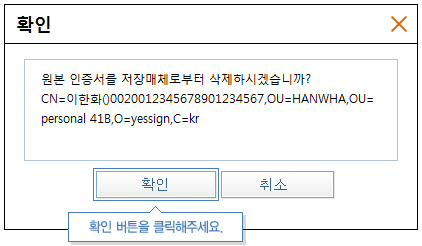 [확인] 버튼을 선택하시면 한쪽 매체에 저장이 되고 [취소] 버튼을 선택하시면 두 개의 매체에 인증서가 저장됩니다.