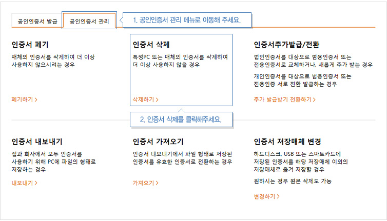 인증센터 메뉴로 이동한 후 “인증서 관리” 메뉴를 선택한 후 [인증서 삭제]를 클릭하세요.