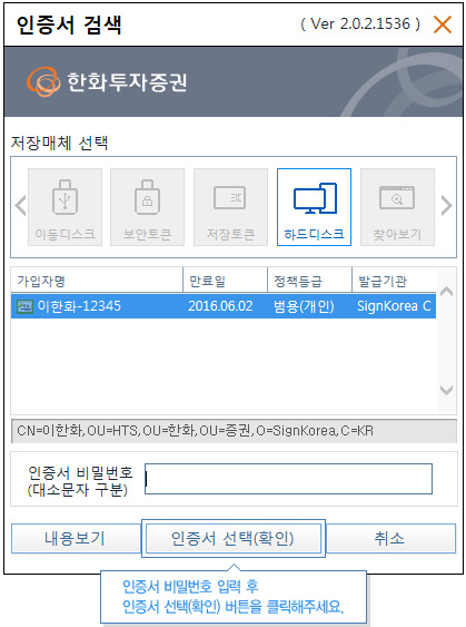 인증서 선택 후 “전자서명비밀번호”를 입력하신 후 [인증서선택(확인)] 버튼을 선택합니다.